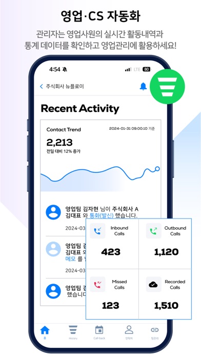 1. - 영업사원이 법인 스마트폰으로 통화한 통화기록, 녹음파일, 연락처를 자동으로 클라우드에 동기화해 안전하고 보기쉽게 자동으로 정리, 관리자 앱에서 조회할수 있습니다.