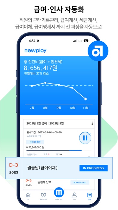 5. - 근무기록 데이터를 기반으로 자동 급여계산, 급여대장 생성, 급여이체, 원천세 신고 및 납부까지 올인원 급여처리가 진행됩니다.