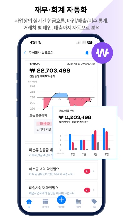 6. 사업장의 실시간 현금흐름, 세금계산서등을 통한 매입·매출·미수 통계, 그리고 거래처별 매입·매출 분석까지 자동으로 분석해 제공합니다.