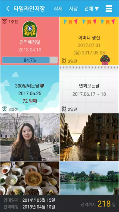 1. kt영상전화기에서 부가서비스에 가입된 군장병은 타임라인으로 저장된 개인정보(사진, 일정, 기념일 등)을 확인 하실 수 있으며, 개인 스마트폰으로 다운로드 받을 수 있습니다.