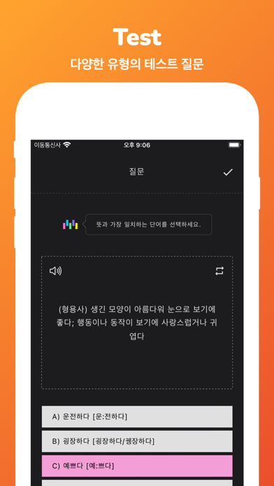 - 모든 플래시 카드에 포함된 오디오를 통해 리스닝과 발음 연습을 할 수 있는 기능
