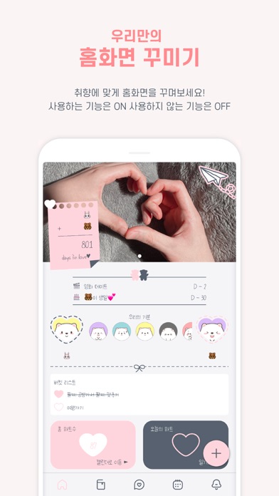 - 홈: 커플들이 취향에 맞게 홈을 꾸밀 수 있고, 필요한 기능들을 사용할 수 있는 공간