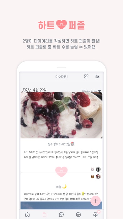 - 다이어리: 하루에 2개의 일기를 작성하면 하트 퍼즐이 완성되며, 연인과 함께 추억을 쌓을 수 있는 기능