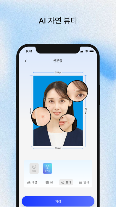 1. 증명사진 이미지 개선하려니 너무 예뻐서 걱정되네요? 'AI증명사진어플' 은 독특한 얼굴 뷰티 기술로 피부톤 개선, 잡티 제거, 인식 가능한 특징 유지, 자연스럽고 아름다운 증명사진 연출이 가능해요.