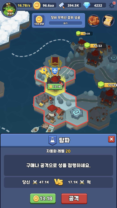 2. 크라운럼블은 왕이 되어 영지를 넓혀가고 군대를 강화시켜 전 지역을 통일해 킹덤을 만들어가는 방치형 시뮬레이션과 전략 전투가 결합된 게임입니다.