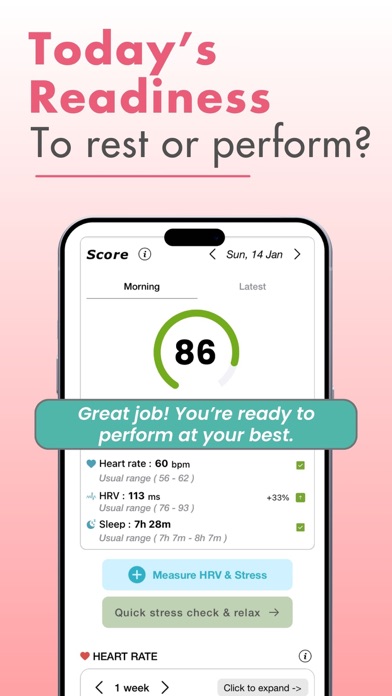 4. 장치의 카메라를 사용하여 30초 만에 심박수를 측정하고 정확한 HRV 읽기를 얻습니다—HRV를 스트레스, 에너지, 건강 등의 지표로 세분화합니다.