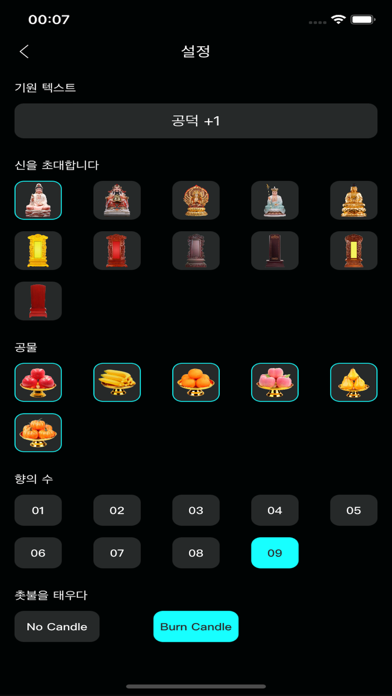 4. 향을 피우고 부처님께 공양하기: 향을 피우는 시간, 촛불을 켜는 시간을 수동으로 설정하고 보살 숭배와 과일 공양을 설정하여 기도를 더욱 효과적으로 만듭니다.