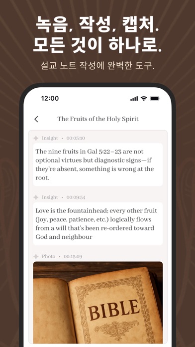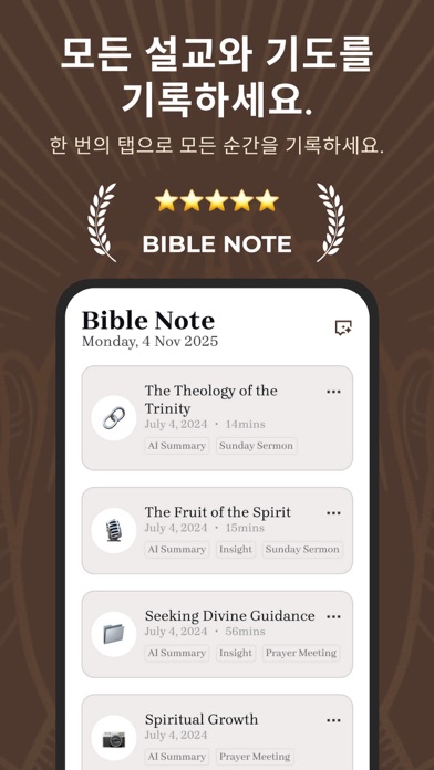 2. Bible Note Taker & Recorder는 당신의 모든 영감을 보존하고, 대화를 다시 듣고, 영적 진리를 더 깊이 탐구하도록 돕습니다.